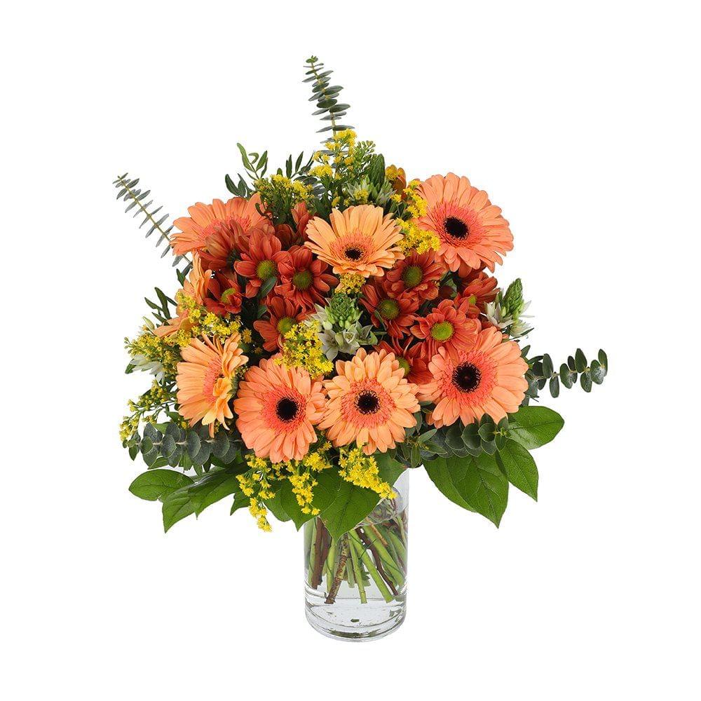 Arranjo de flores em forma de buquê, com gerberas, margaridas, solidago e várias verduras a complementar. Um buquê vistoso com tonalidades de cores que se complementam perfeitamente entre si.