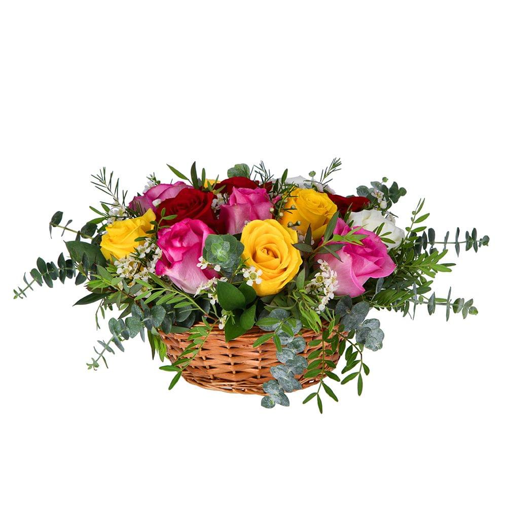 Decore a sua casa ou o local de trabalho de alguém especial com esta magnífica cesta de rosas coloridas. O “poder” da mistura de rosas de várias cores tem um efeito que provoca bem-estar, tranquilidade e conforto.
