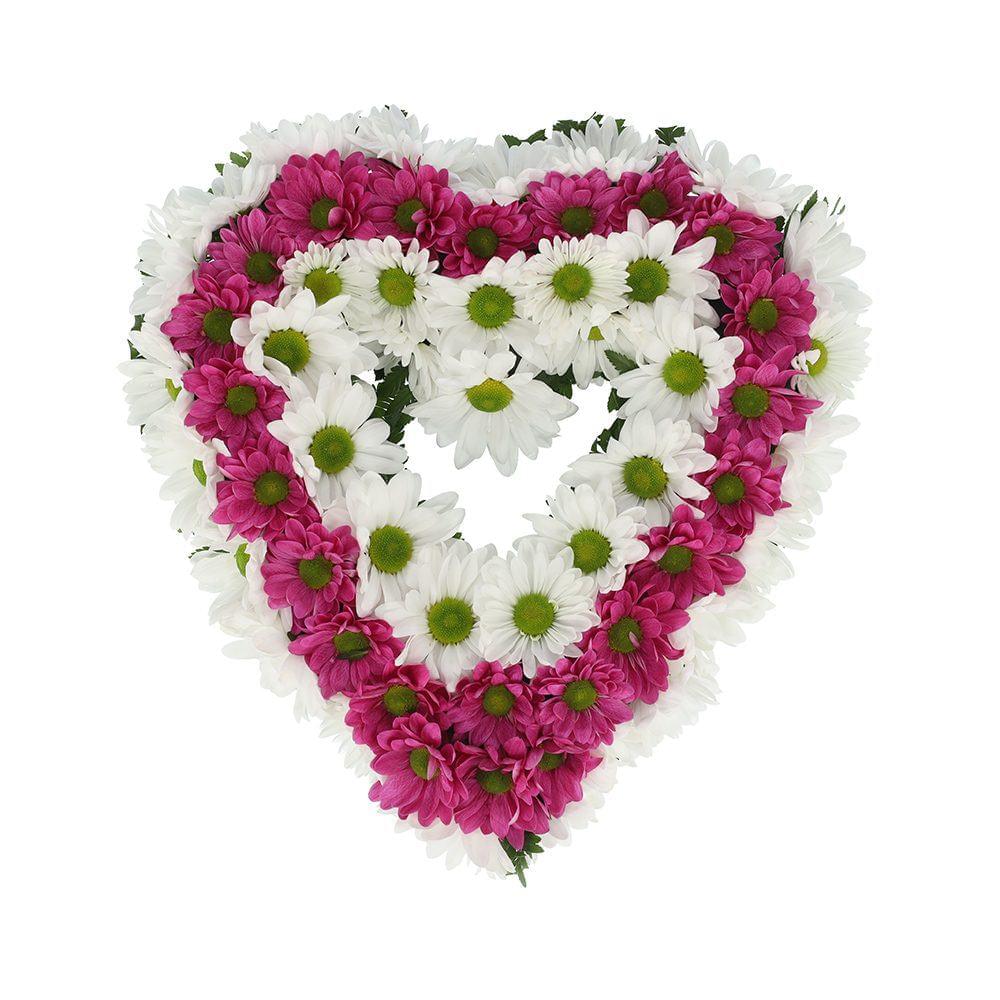 Coração de flores para funeral composto por margaridas brancas e cor de rosa. Este coração apresenta um bonito design floral e é uma boa solução para quem pretende fazer uma homenagem.