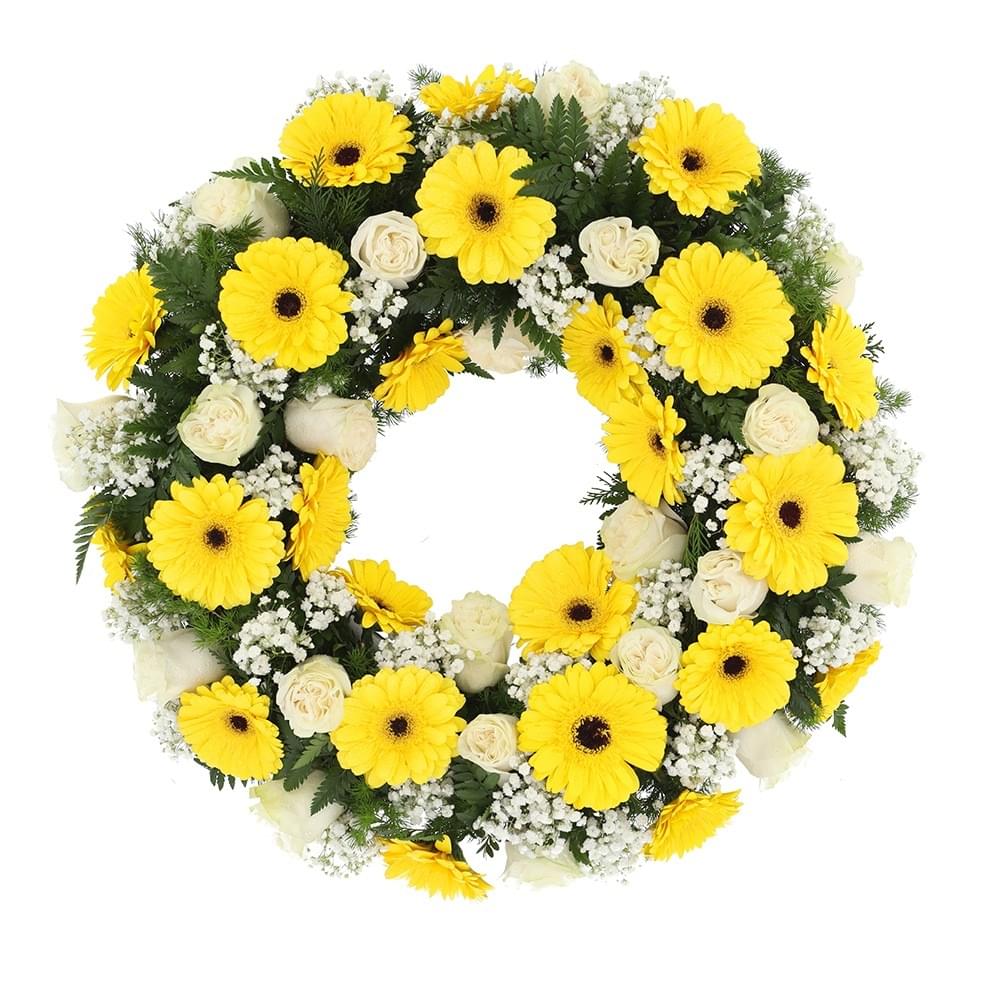 Coroa de flores constituída por rosas brancas e gerberas amarelas. Envie esta coroa de funeral para transmitir os sentimentos profundos do seu coração, que não consegue no momento expressar em palavras.