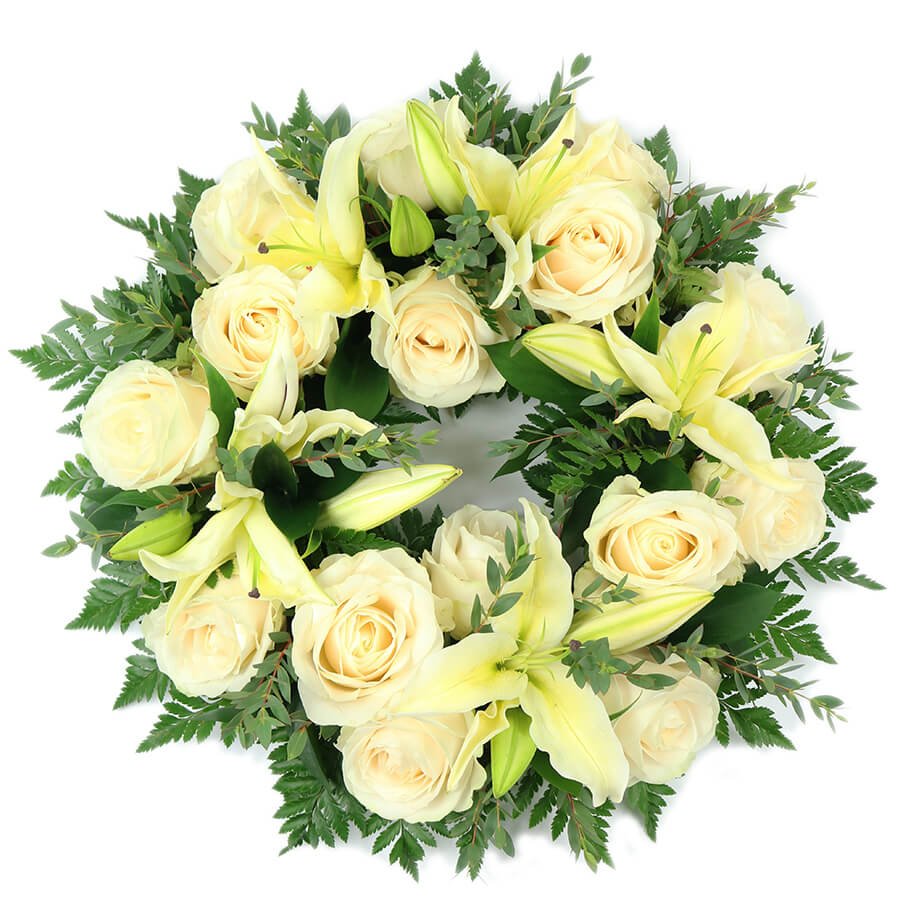 Honre a memória de alguém especial através da oferta desta delicada coroa de flores em tons pérola para funeral. Expresse as suas condolências com um bonito cartão de pêsames e escolha o dia da entrega.