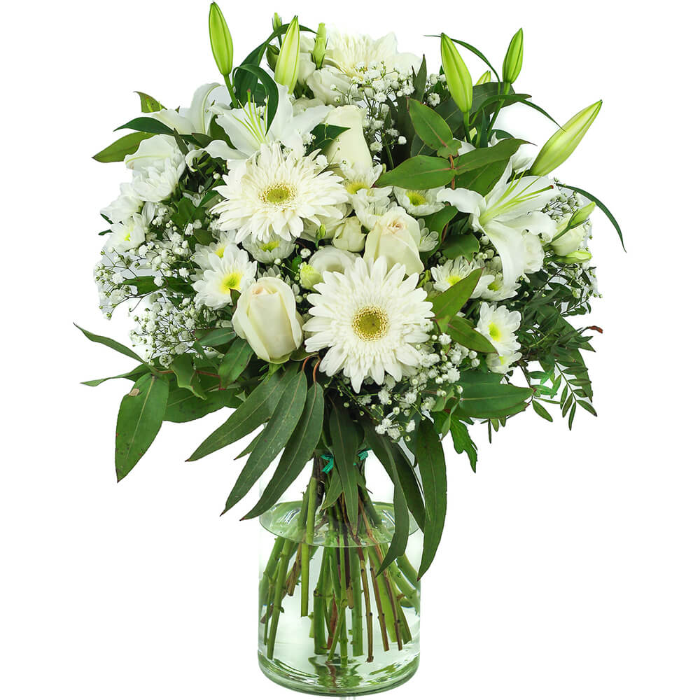 Belíssimo arranjo de flores brancas. Este arranjo é perfeito para transmitir carinho, ternura e apoio. Selecione o tamanho pretendido para o seu arranjo: Base, Médio ou Premium (Igual à imagem).
